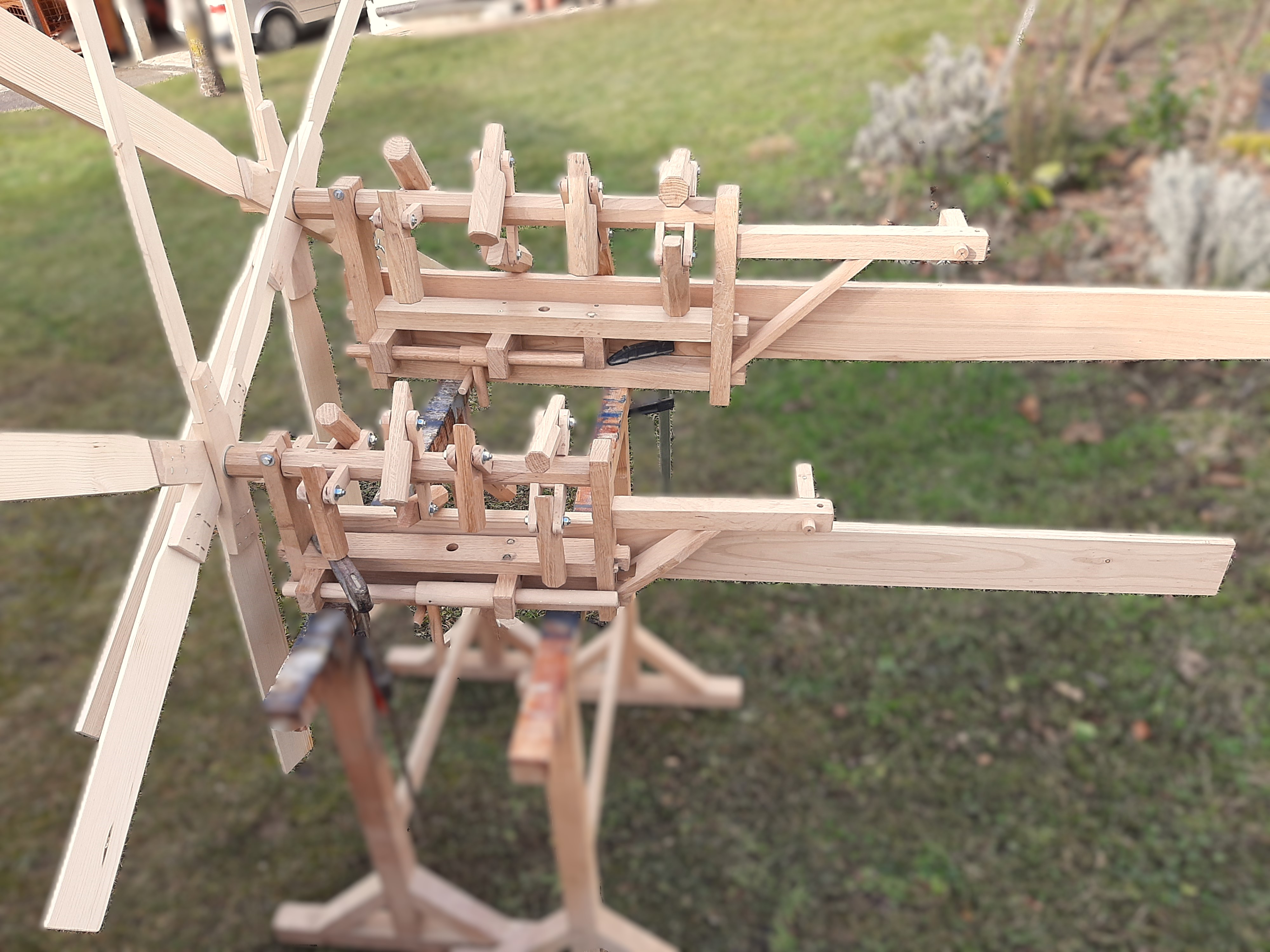 Vsak del je narejen iz druge vrste lesa: gred je narejena iz trpežnega in trdega hrasta, kladivca iz akacije in deska iz kostanjevega lesa. Da se veter lažje ujame v vetrnico, je ta narejena iz lahkega topolovega lesa. Za rep so najprimernejše brezove veje, ki dobro ujamejo veter in ne odvržejo listja prav kmalu.